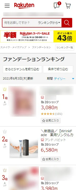 ※リキッドファンデーション 第1位 2021年6月2日集計(2021年6月3日更新) デイリーランキング