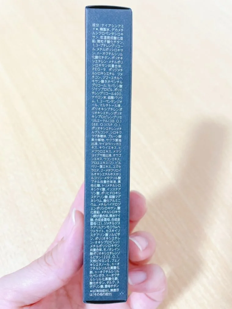 ナイアシンアミド、精製水、デカメチルシクロペンタシロキサン、低温焼成酸化亜鉛、微粒子酸化チタン、1,3-ブチレングリコール、メチルポリシロキサン、n-オクチルシリル化酸化チタン、ポリオキシエチレン・メチルポリシロキサン共重合体、PEG-9 ポリジメチルシロキシエチル ジメチコン、ジ2-エチルヘキサン酸ネオペンチルグリコール、セバシン酸ジイソプロピル、ポリエチレングリコール400、ナイロン末、硫酸バリウム、1,2-ペンタンジオール、マルチトール液、ポリオキシブチレンポリオキシエチレンポリオキシプロピレングリセリルエーテル(3B.O.)(8E.O.)(5P.O.)、ポリオキシエチレンメチルグルコシド、シロキクラゲ多糖体、プルーン酵素分解物、サクラ葉抽出液、セイヨウハッカエキス、キウイエキス、ヒメフウロエキス、メマツヨイグサ抽出液、オウゴンエキス、ウコンエキス、アロエエキス(2)、ビルベリー葉エキス、ユズセラミド、2-メタクリロイルオキシエチルホスホリルコリン・メタクリル酸ブチル共重合体液、異性化糖、トリメチルシロキシケイ酸、イソステアリン酸、ポリヒドロキシステアリン酸、硫酸マグネシウム、酸化アルミニウム、メチルハイドロジェンポリシロキサン、酸化亜鉛、メチルシロキサン網状重合体、無水ケイ酸、合成金雲母、合成金雲母(2)、ジメチルジステアリルアンモニウムヘクトライト、セスキイソステアリン酸ソルビタン、ポリ(オキシエチレン・オキシプロピレン)メチルポリシロキサン共重合体、モノオレイン酸ポリオキシエチレンソルビタン(20E.O.)、天然ビタミンE、フェノキシエタノール、n-オクチルシリル化黄酸化鉄、n-オクチルシリル化ベンガラ、n-オクチルシリル化黒酸化鉄、酸化チタン、タルク、ステアリン酸、雲母チタン